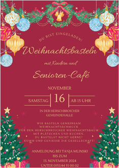 Am 16. November ab 15 Uhr laden wir in Herschbroich zu einem kreativen Bastelnachmittag in die Gemeindehalle ein. Gemeinsam gestalten wir Weihnachtsdekoration für den Herschbroicher Weihnachtsbaum. Senioren, Plauderfreunde, Familien, Kinder und Großeltern sind herzlich willkommen. Ihr bastelt nicht gerne? Kein Problem, lasst uns einen gemütlichen Nachmittag gemeinsam verbringen. Die Bastelfreudigen bitten wir, etwas Bastelmaterial für die individuellen Bastelwerke mitzubringen. Für Plätzchen, Kuchen, Kaffee und Getränke ist gesorgt, gute Laune und vorweihnachtliche Stimmung ist garantiert. Meldet Euch bitte bei Tanja Mlinski unter 0151 - 44550002 an. Wir freuen uns auf Dich!