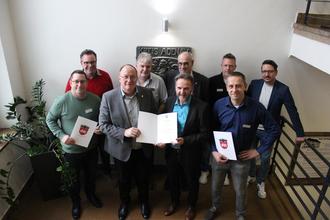 Bürgermeister Guido Nisius (2.v.l.) gratulierte Jürgen Adriany (2.v.r.) zum 40-jährigen sowie Michael Schober (r.) und Christian Backes (l.) zum 25-jährigen Dienstjubiläum. Den Glückwünschen schlossen sich an (hintere Reihe v.li.): Bernd Schmitz (stellv. Werkleiter), Siegbert Justen (Fachbereichsleiter Planen und Bauen), Bernhard Jüngling (Fachbereichsleiter Organisation und Verwaltungssteuerung), Thorsten Thelen (Fachbereichsleiter Finanzen und Abgaben) sowie Tim Schneider (Personalrat)