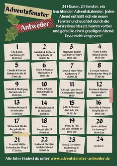 24 Häuser, 24 Fenster, ein leuchtender Adventskalender. Mach mit beim Adventsfenster in Antweiler