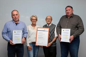 ADENAU. Nachdem Elektromeister Hermann Lehmann im Jahre 2018 mit dem Goldenen und dem Diamantenen Meisterbrief von der Handwerkskammer Koblenz geehrt wurde, wurde ihm am 17. Oktober 2023 nun der recht selten verliehene Eiserne Meisterbrief von Kurt Krautscheid, Präsident der Handwerkskammer Koblenz, übergeben. Anlässlich einer Betriebsfeier gratulierte die Geschäftsführerin in 3. Generation, Susanne Lehmann, am 30. Oktober 2023 den Betriebsmitarbeitern Heinz Weber und Peter Pauly zu ihrer langjährigen Betriebszugehörigkeit. Betriebsleiter Heinz Weber ist bereits seit 40 Jahren Teil der Firma LE Lehmann Elektrotechnik, Obermonteur Peter Pauly seit nunmehr 28 Jahren.