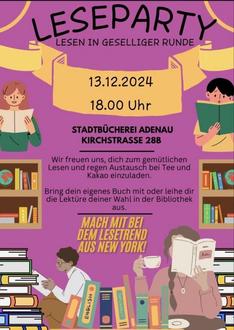 Ein Trend aus New York erobert die Welt – am 13.12.2024 um 18 Uhr auch Adenau? Eine Leseparty (Reading-Party) ist eine tolle Gelegenheit Zeit mit Freunden zu verbringen und neue Bekanntschaften zu knüpfen, aber auch Zeit für sich selbst zu nehmen. Hier in der Stadtbücherei Adenau bieten wir erstmalig in Kooperation mit dem Erich-Klausener-Gymnasium diese Möglichkeit für junge Leute an.