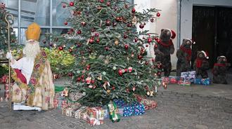 Da er dieses Jahr allein war, bat der Nikolaus die Kinder des Hönninger Kindergartens, die seit dem Hochwasser im alten Adenauer Kindergartengebäude untergekommen sind, um Hilfe. Über 35 Kinder fanden sich mit Erzieherinnen im Atrium ein. Sie hielten den Atem an, als sie den riesigen Weihnachtsbaum sahen und den Nikolaus erschöpft auf dem Stuhl daneben.