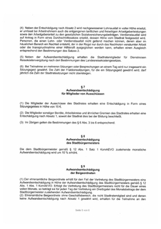 | (1) | Zur Abgeltung der notwendigen baren Auslagen und der sonstigen persönlichen Aufwendungen erhalten die Stadtratsmitglieder für die Teilnahme an Sitzungen des Stadtrats eine Entschädigung nach Maßgabe der Absätze 2 bis 6. |