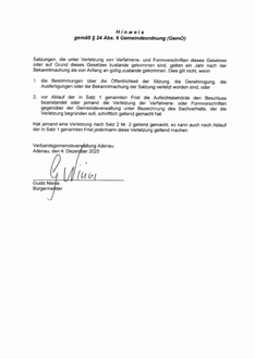 | (5) | Kann wegen eines Naturereignisses oder wegen anderer besonderer Umstände die vorgeschriebene Bekanntmachungsform nicht angewandt werden, so erfolgt in unaufschiebbaren Fällen die öffentliche Bekanntmachung durch öffentlichen Ausruf. Die Bekanntmachung ist unverzüglich nach Beseitigung des Hindernisses in der vorgeschriebenen Form nachzuholen, sofern nicht der Inhalt der Bekanntmachung durch Zeitablauf gegenstandslos geworden ist. |