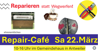 Geben Sie Ihrem Schätzchen eine Chance. Schonen Sie Ihren Geldbeutel und die Umwelt. Kommen Sie mit Ihrem defekten Stück einfach vorbei. Wir reparieren, wenn möglich. Das Angebot richtet sich an alle Bürgerinnen und Bürger aus Antweiler sowie aus den umliegenden Ortsgemeinden.