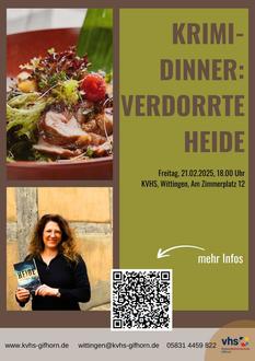Erleben Sie einen „mörderischen“ Abend mit einem kulinarischen 4-Gänge-Menü unserer Köchin Dörte Franke. Zwischen den einzelnen Gängen gibt es eine Autorinnen-Lesung aus dem mystischen Regional-Krimi „Verdorrte Heide“, in dem es um ungeklärte Vermisstenfälle aus den Siebzigerjahren und um eine alte Sage geht, die ein dunkles Geheimnis in sich birgt…
