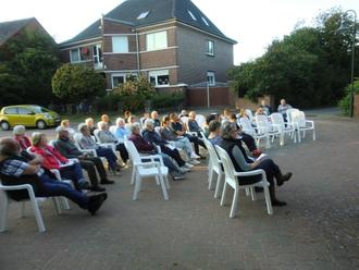 Zuhörer aus Radenbeck, Plastau und Zasenbeck beim Friedensgottesdienst 2024 im Rondell in der Ortsmitte Plastau.