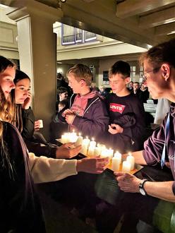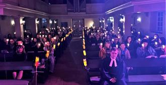 Als Höhepunkt des Gottesdienstes entzündeten die Konfirmanden, Mitglieder des Kirchenvorstands und die beiden Pastoren gemeinsam ein Glaubensfeuer am Altar und gaben das Licht an alle Anwesenden weiter. Nach und nach füllte sich die Kirche mit Kerzenlicht und tauchte den Raum in eine ganz besondere Stimmung.