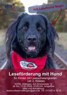 Information: Das entgeltfreie Angebot in Kooperation mit dem ausgebildeten Lesehund-Team Beatrice Seer & Major richtet sich vor allem an Kinder mit Legasthenie, LRS, ADHS/ADS oder anderen Leseschwierigkeiten. Bei Interesse wenden Sie sich bitte direkt an: lesehundteam.wittingen@gmx.de, Tel. 0174 5147935.