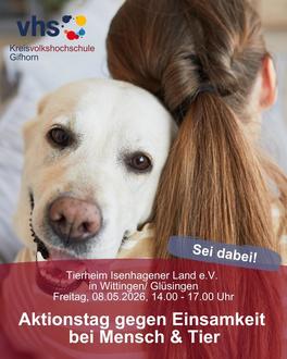 Die KVHS wird aktiv gegen Einsamkeit bei Mensch & Tier und hat sich dazu mit dem Tierheim zusammengetan. Geboten wird ein vergnüglicher Nachmittag für Jung & Alt, allein oder nicht. Alle sind eingeladen, das Tierheim kennenzulernen und zusammen Spaß zu haben.