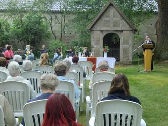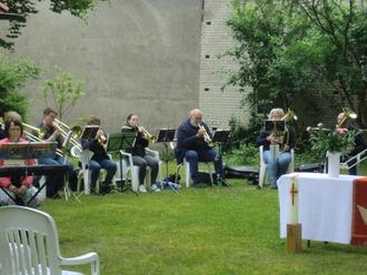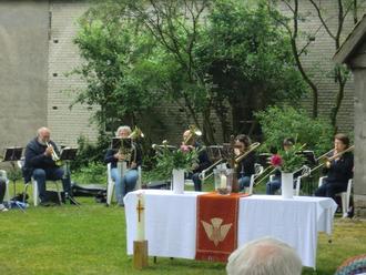 Mit 10 Blas-Musiker/rinnen wurde am Pfingstmontag der "Freiluft-Gottesdienst" neben der alten St.Johannes Wehrkirche begleitet.