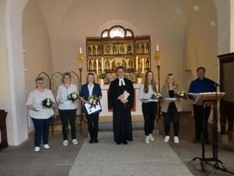 Radenbeck. Mit dem Orgelvorspiel von Rolf Wiesensee-Bammel und der Begrüßung durch Pastor Florian Herterich, wurde der Festgottesdienst zur Einführung der neuen Kirchenvorsteher/rinnen der Kirchengemeinde Zasenbeck/Radenbeck in der St.Jacobuskirche Radenbeck eröffnet. Anschließend wurde gemeinsam das Lied „Schenk uns Zeit“ gesungen. Pastor Herterich war sehr erfreut neben den zahlreichen Gottesdienstbesuchern aus Zasenbeck, Plastau und Radenbeck auch Besucher aus Schneflingen, Knesebeck und Vorhop begrüßen zu können. Mit dem Psalm „Herr, deine Güte reicht soweit“, wurde die Kirchengemeinde zum 2. Sonntag nach Trinitatis auf den festlichen Gottesdienst „eingeschworen“. Nach der Liturgie und Tagesgebet wurde Martin Luthers wohl bekanntestes Lied: “Ein feste Burg ist unser Gott“ gemeinsam intoniert. Nach der Lesung aus 1. Korinther 12, Verse 4-11 wurde das Lied „Möge die Straße“ mit dem Text mündlich aus Irland gemeinsam gesungen. Anschließend wurden die Kirchenvorsteher Martin Peter, Wolfgang Kröger (Radenbeck), Eckhard Behn (Plastau) und Kirchenvorsteherin Lena Albroscheid (Zasenbeck) aus dem Kirchendienst verabschiedet. Pastor Herterich dankte ihnen für ihre 6 jährige Tätigkeit zum Wohle der Kirchengemeinde Zasenbeck/Radenbeck und überreichte ihnen die Entlassungsurkunden. Mit dem Lied „Die Himmel erzählen die Ehre Gottes“, wurde die Einführung der neuen Kirchenvorsteher/rinnen eingeleitet. Aus Radenbeck sind dieses: Leonie Benecke, Rhea Lemme, Reni Otte und Jörg Lemme. Aus Zasenbeck sind Anne-Dörthe Lilje und Tanja Behn erneut dabei. Sie erhielten Urkunden der Landeskirche Hannover, einen Blumenstrauß und das Buch „Brot und Liebe“ sowie einen Ordner mit dem Inhalt „Richtlinien und Bestimmungen für Kirchenvorstandsarbeit.“ Auf die