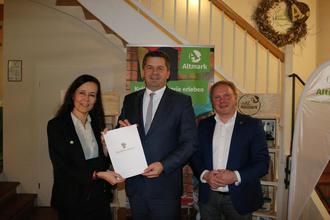 Minister Sven Schulze, Ministerium für Wirtschaft, Tourismus, Landwirtschaft und Forsten des Landes Sachsen-Anhalt übergab am 01.12.2023 den Förderbescheid aus Tourismusmitteln für die weitere Umsetzung von Tourismusprojekten in der Altmark an den Altmärkischen Regionalmarketing- und Tourismusverband (ART) in der Geschäftsstelle in Tangermünde.