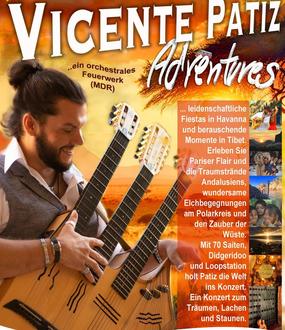 Mit einer charmanten und hochgradig kurzweiligen Mischung von Klanglandschaften und virtuosen Instrumentals entführt uns der vielfach preisgekrönte Gitarrenzauberer Vicente Patiz auf eine spannende Safari rund um den Globus, seine Abenteuerreisen, ein Konzertweltrekord und mittlerweile über 2000 Konzerte lieferten Inspiration für einen unvergesslichen Konzertmoment.