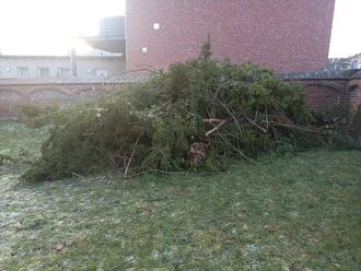 Jedoch eine riesige Eibe und eine zu einem kleinen Wäldchen herangewachsene Eiben-Hecke breiteten ihre ausladenden Äste weiterhin aus, die inzwischen die Oberfläche von einigen Grabsteine massiv beschädigt hatten. Vor allem sie sollten beim Arbeitseinsatz beseitigt werden. In Windeseile wurden alle störenden Äste entfernt und zu einem riesigen Haufen zusammengetragen. Auch Müll, der immer mal wieder über die Friedhofsmauer geworfen wird, wurde von den Stadtführerkindern aufgesammelt.
