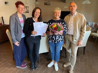 Urkundenübergabe zur erfolgreichen 4 Sterne-DTV Klassifizierung begleitet durch Doreen Prox (1.v.l.) vom Tangermünder Tourismusbüro und Steffen Schilm, Bürgermeister der Stadt Tangermünde, übergeben durch ART Geschäftsführerin Carla Reckling-Kurz an Steffi Albrecht vom Reiterhof Albrecht in Buch.