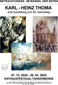 Karl-Heinz Thoma malt seit frühester Jugend und arbeitet seit Beendigung seines Kunststudiums als freischaffender Künstler. Viele seine Arbeiten befinden sich in Privatsammlungen und öffentlichen Einrichtungen. Auch die Städtischen Museen in Tangermünde besitzen vier seiner Gemälde. Anlässlich seines 85. Geburtstages laden der Künstler und der Kultur- und Museumsverein Tangermünde e. V. zum Besuch seiner Ausstellung „Betrachtungen - im Wandel der Zeiten“ in den Rathausfestsaal ein.
