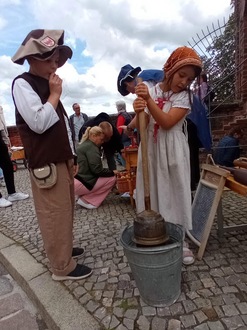 Tangermünder Burgfest - Martha und Johann zeigen altes Handwerk (Waschweibdiplom) an den Putinnen