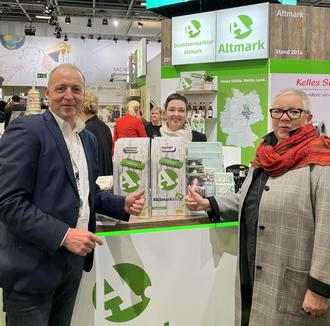 Am Altmark-Stand wurde die neue Variante der Altmark-Kiste während der gesamten Grünen Woche 2024 präsentiert. Am Tag der Altmark, 20. Januar 2024: (v.l.) Wolfgang Zahn (AMG), Stephanie Grunert (ART) und Christa Ringkamp (Landhof Neulingen).