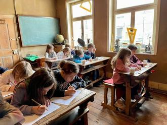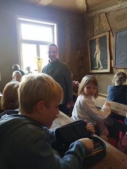 Aber in einer entsprechenden Umgebung lernt es sich noch besser. Deshalb freuten sich die Stadtführerkinder, als Tiemo Schönwald ihnen erlaubte, ins historische Klassenzimmer des Exempels zu gehen. Dort wurden sie von Herrn Ewald in die strengen Verhaltensregeln eingewiesen, an die sich ihre Urgroßeltern in der Schule noch halten mussten. Anton hatte ganz vorbildlich, wie er es aus der Schule kennt, seine Federtasche auf den Tisch gelegt. Aber nein! So etwas gab es doch damals noch gar nicht, erfuhren alle von Herrn Ewald. Bestenfalls einen Bleistift hatten die Kinder. Jeder erhielt sein Namenskärtchen in alter Schrift. Das Vorlesen der Namen klappte schon prima. Nun ging es an das Schreiben. Bald standen in Schönschrift die Sütterlin-Buchstaben auf dem Blatt.