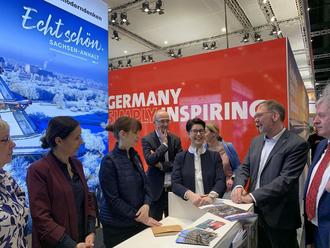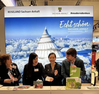 Das Reiseland Sachsen-Anhalt präsentiert sich als starkes touristisches Netzwerk auf der ITB 2024 – Internationale Tourismusbörse Berlin (v.l.n.r. Frauke Flenker-Manthey und Annika Jeschek von der Investitions- und Marketinggesellschaft Sachsen-Anhalt mbH.
