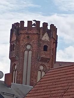 Ende Juli/Anfang August werden die Jungstörchen flügge und wir können sie bei ihren ersten Flugversuchen über den Dächern unserer Stadt beobachten. Das ist auch die Zeit, zu der wir sie auf fast jeder Zinne unserer Türme und auf dem langen First des Daches unserer Stephanskirche beobachten können.
