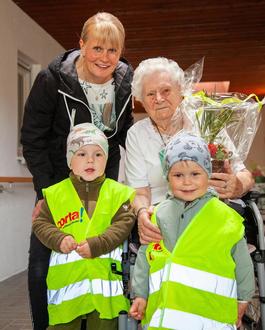 Die „Löwenherz“-Gruppe der Johanniter-Kita „Kleine Ritter“ um deren Erzieherin Katja Grützmann (o.l.) haben Humanas-Bewohnerin Erna Tuscher zu ihrem 104. Geburtstag mit einem Ständchen überrascht. Zur Kita-Gruppe gehören unter anderem Levi (u.l.) und Magnus.