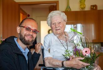 Nach den Kita-Kids und ihre Erzieherin hatte dann auch Humanas-Geschäftsführer Fabian Biastoch Gelegenheit, der ältesten Humanas-Bewohnerin zu ihrem 104. Geburtstag zu gratulieren und einen