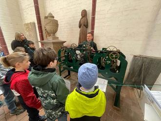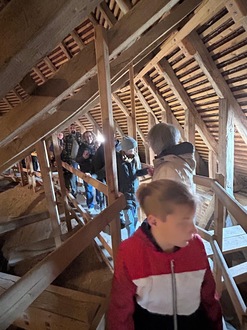 Damit verbunden war der abenteuerliche Aufstieg auf den Kirchturm der St. Stephanskirche bis hinauf in die Welsche Haube zum Uhrwerk direkt unter den Ziffernblättern. Nachdem sie unten in der Kirche vom Fachmann mit jeder Menge Wissen über die Geschichte und Funktionsweise der Kirchturmuhr ausgestattet wurden, stiegen sie anschließend die insgesamt 234 Stufen hinauf zum kürzlich sanierten Uhrwerk. Auf dem Weg dorthin machten sie Station unter dem gewaltigen Kirchendach und konnten sich die Rückseite des Gewölbes – das sogenannte „Steinmeer“ – ansehen. Aber auch kleine Details wie Reste einer mittelalterlichen Rüstung, der Kamin in der Türmer-Stube, die gewaltigen Glocken und die Gewichte des Uhrwerkes faszinierten die Forscher.