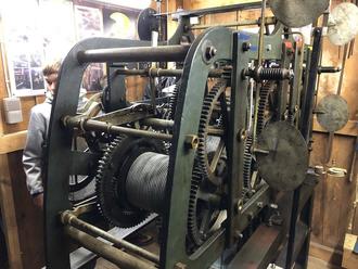 Das alte Uhrwerk steht heute im Umgangschor der Stephanskirche und war bis 1941 in Betrieb. Auf dem Foto erklärt Volker Schulz gerade dessen Funktionsweise. Und er kann es sogar noch in Gang setzen!