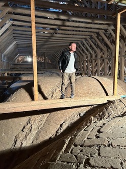 Volker Schulz steht auf einem Balken des Dachstuhls der Stephanskirche. Die meisten Balken sind etwa 600 Jahre alt, habe also den Grete-Minde-Brand überstanden. Das Kirchendach fing zwar Feuer, konnte aber gelöscht werden.
