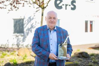 Stolz hält Detlef R. Elling, Geschäftsführer der e-r-s GmbH, den Pokal des Wirtschaftspreises Altmark 2023 in der Kategorie "Handwerk".