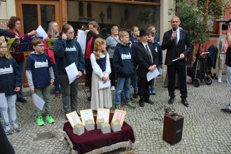 Nach der Eröffnung der Veranstaltung durch Flötenmusik richtete sich der Tangermünder Bürgermeister mit einer bewegenden Rede an die Anwesenden. Er sprach von einer traurigen, jetzt aber auch freudigen Zeit. Er erinnerte an die schreckliche Zeit des Nationalsozialismus mit Terror, Verfolgung und Mord, der wir nun mit Demut gedenken. „Mögen diese Steine ein Symbol gegen das Vergessen sein, ein Mahnmal gegen Faschismus, deren Unrecht sich nie wiederholen darf“, so sagte er und forderte: „Nie wieder Hass und Antisemitismus“. Bei Petra Hoffmann bedankte er sich besonders, hatte sie doch für die Aufarbeitung der Geschichte und die Einladung der ausländischen Gäste gesorgt. Die Tangermünder Stadtführerkinder und Jungen Stadtführer stellten in ihrer Rede die einzelnen Personen vor, für die nun Stolpersteine verlegt werden sollten. Der Ehrengast Ezequiel Max - Urenkel von Helmut Markus - sprach ebenfalls zu den Gästen, bedankte sich bei den Organisatoren der Veranstaltung, die nicht nur „Hoffnung für eine bessere Welt spenden“. Er dankte auch den zahlreichen Sponsoren, die die Kosten der langen Reisen der Ehrengäste übernommen hatten.