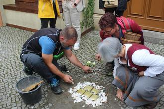 Marko Mälitz, Teamleiter beim städtischen Bauhof, übernahm die Zeremonie der Stolpersteinverlegung. Er fügte die fünf Stolpersteine für die Familie Markus in die vorbereitete Stelle auf dem Gehweg vor ihrem ehemaligen Wohn- und Geschäftshaus ein. Gemeinsam mit vielen Anwesenden wurde abschließend die neue Gedenkstätte mit kleinen Steinen und Rosenblättern geschmückt.