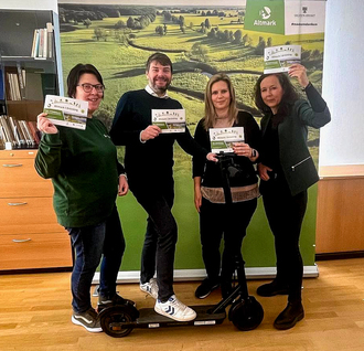 (v.l.n.r.) Sabine Wieter (UNESCO-Biosphärenreservat Drömling), Martin Schulze (Lan-destourismusverband Sachsen-Anhalt), Juliane Ruttkowski (UNESCO-Biosphärenreservat Drömling) und Carla Reckling-Kurz (ART) stellen die neue Rad- und Wanderbroschüre über den Drömling vor.