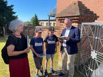 Thorben Prox und Leander Günther mit Dr. Rainer Haseloff auf dem jüdischen Friedhof.