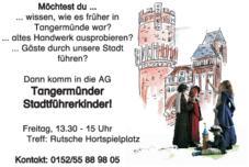 Die Arbeit in den Stadtführergruppen ist sehr abwechslungsreich, denn neben dem Studium der Geschichte von Tangermünde steht auch das Erlernen alter Handwerkstechniken auf dem Programm. Die Stadtführerkinder und Jungen Stadtführer können ein großes Fachwerkhausmodell aufbauen, aus Sahne Butter im Butterfass herstellen, aus Schafwolle etwas filzen oder auch ausprobieren, wie mit dem Spinnrad ein Faden aus Schafwolle entsteht. Es macht ihnen Spaß, Wäsche wie früher mit dem Waschbrett zu waschen oder ein Springseil mithilfe einer Seilerei herzustellen.