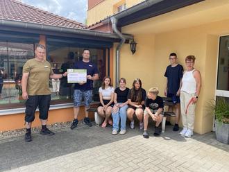 Im Beisein einiger Jugendlicher der DRK-Anne-Frank-Häuser haben Pflegefachkraft Christian Blumrodt aus Grieben (v.l.) und Pflegedienstleiter Thomas Gmell vom Humanas-Wohnpark in Tangerhütte den Spendenscheck an die Mitarbeiterin der Kinder- und Jugendhäuser „Anne Frank“ in Tangerhütte, Frau Teschner (r.), übergeben.