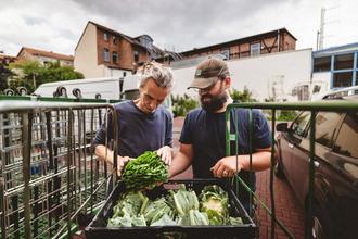 Felix Neumann von Grünland Der Bioladen (links) prüft mit seinem Mitarbeiter die Ware für die Jobkiste, die seit der Preisauszeichnung richtig Fahrt aufgenommen hat.