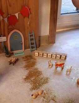 Die Kinder erwartete in der Adventszeit eine große Überraschung. Ein Weihnachtswichtel war bei uns eingezogen. Anfangs nur zu erkennen an einer kleinen hölzernen Tür, einem Tannenbäumchen und einem winzigen Schlitten. Die Kinder waren unglaublich neugierig und begeistert. Der kleine Wichtel, mit Namen Herbert, stellte sich uns anhand eines Briefes vor.