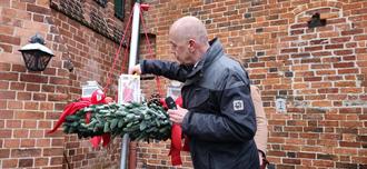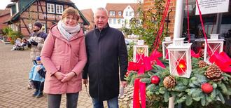 Die dritte Kerze auf dem großen Adventskranz auf dem Winkelplatz entzündete Ulf Schmidt, hier auf dem Foto mit Angela Geschonke von der Tourist-Info, die sicherlich aufgeatmet hat, dass die Adventszeit (fast) vorüber ist. Denn auf ihr lastete der größte Teil der Organisationsarbeit für den Weihnachtsmarkt und das Kerze-Anzünden.