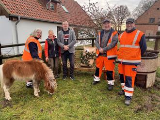 Das Team der Orts- und Grünpflege aus dem Klosterflecken gemeinsam mit Bürgermeister Heiko Senking und Sabine Bracker vom Verein für misshandelte Tiere, die den Gnadenhof leitet.