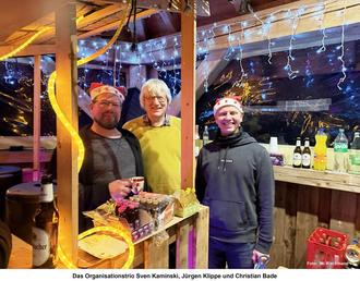 Laut Auskunft des bewährten Organisations- und zugleich Thekentrios, bestehend aus Sven Kaminski (Punsch, Grog, Kräuterbitter), Jürgen Klippe (Würstchen, Würstchen, Würstchen) sowie Christian Bade (Fritten, Bier und Alkoholfreies) hat sich dieses Verfahren bereits bewährt und ist auch kein Zuschussgeschäft. Ein Gewinn ist ohnehin nicht eingeplant, und so geht die Hitze im Regelfall auch mit dem Rauch auf. Die Drei verdienen aber einen kräftigen Applaus aller Stadorfer, sorgen sie doch dafür, dass hier wenigstens noch etwas Geselligkeit in die Gänge kommt!