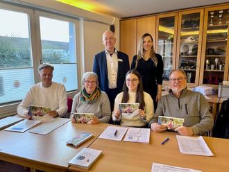 Samtgemeinde-Wahlleiterin Stefanie Maus und Samtgemeindebürgermeister Martin Feller (Hintergrund) überreichen Volker Löhmann (von links), Lissy Förster, Isabelle Daniel und Ralf Sitarz die Gutscheine für die Jod-Sole-Therme.