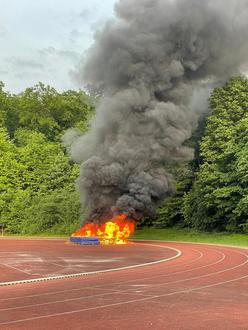 Die Tartanbahn ist schwer beschädigt und die Hochsprungmatte wurde vollständig ein Raub der Flammen.