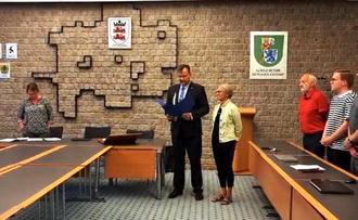 Bürgermeister Senking verliest die Urkunde und überreicht Ute Drewes die Auszeichnung.