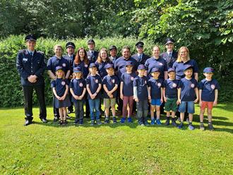 Kinder und Betreuer der Kinderfeuerwehr um den Eschenberg mit Ortsbrandmeistern und stellvertretendem Samtgemeindebrandmeister.