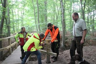 (von links) Levin Neukirch, Arno Bossner, Timon von der Heide legen letzte Hand an den Neubau der Greve-Brücke, rechts Revierleiter Malte Dicke.