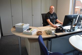Gemeindemitarbeiter Frank Tschepe hat jetzt ein helles Büro. Vor seinem Schreibtisch stehen ein kleiner Tisch und zwei Stühle für Besucher bereit, die mit einem Anliegen in die Gemeindeverwaltung kommen.