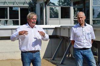 In diesem Schwimmecken werden sie nie wieder mit trockenen Füßen stehen: Bauleiter Uwe Hinzmann gibt Erläuterungen zum Schwimmbadbau, neben ihm Samtgemeindebürgermeister Martin Feller.